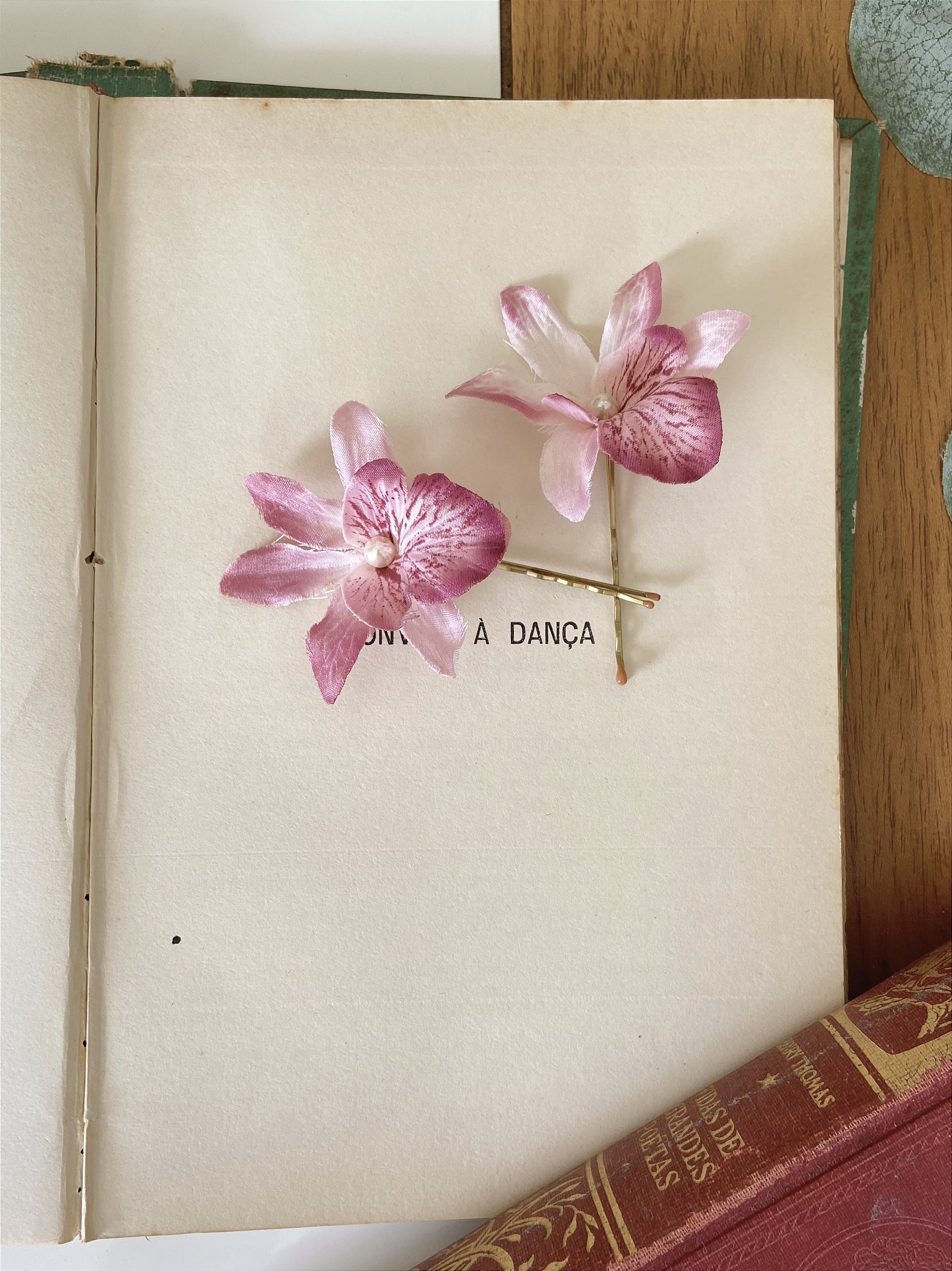 Grampo com aplicação de flores permantes e pérolas abs.