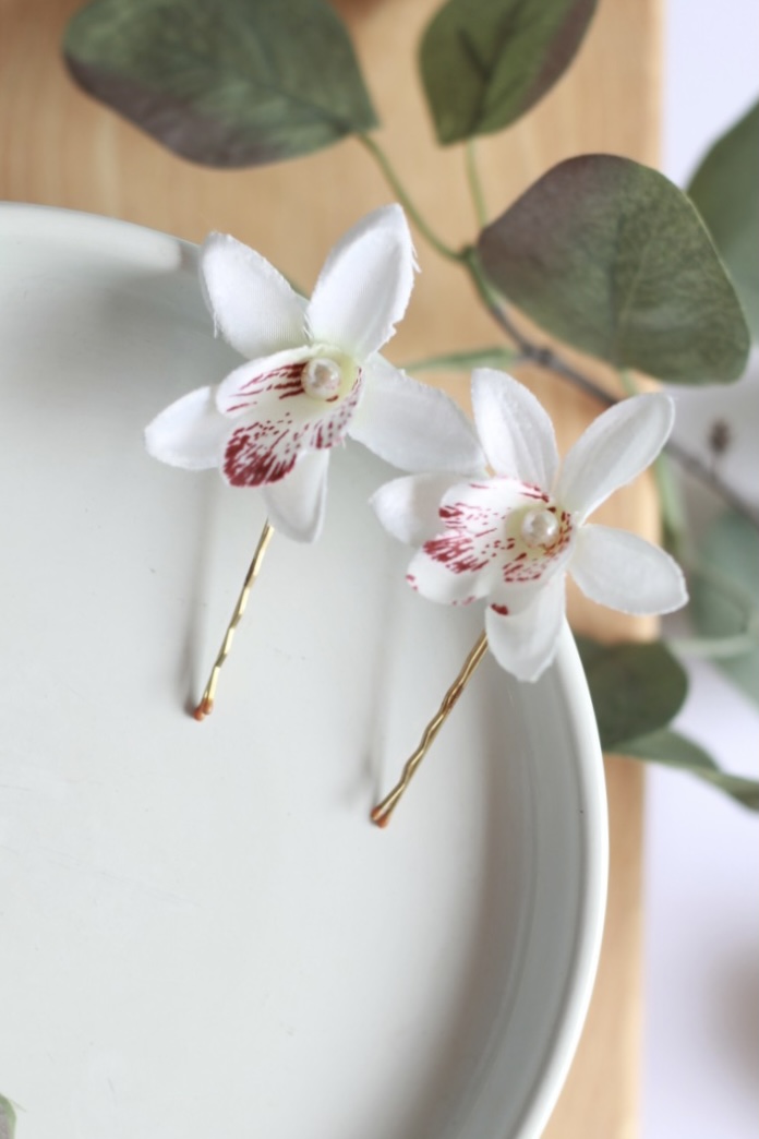 Dupla de grampos com aplicação de orquídeas em tecido e miolos de pérolas.