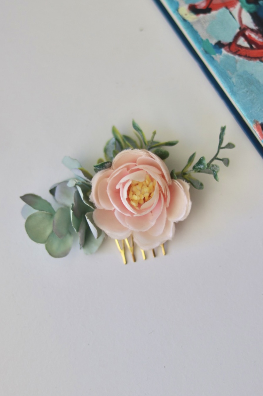 Pente de metal com aplicação de flores e folhagens permanentes.