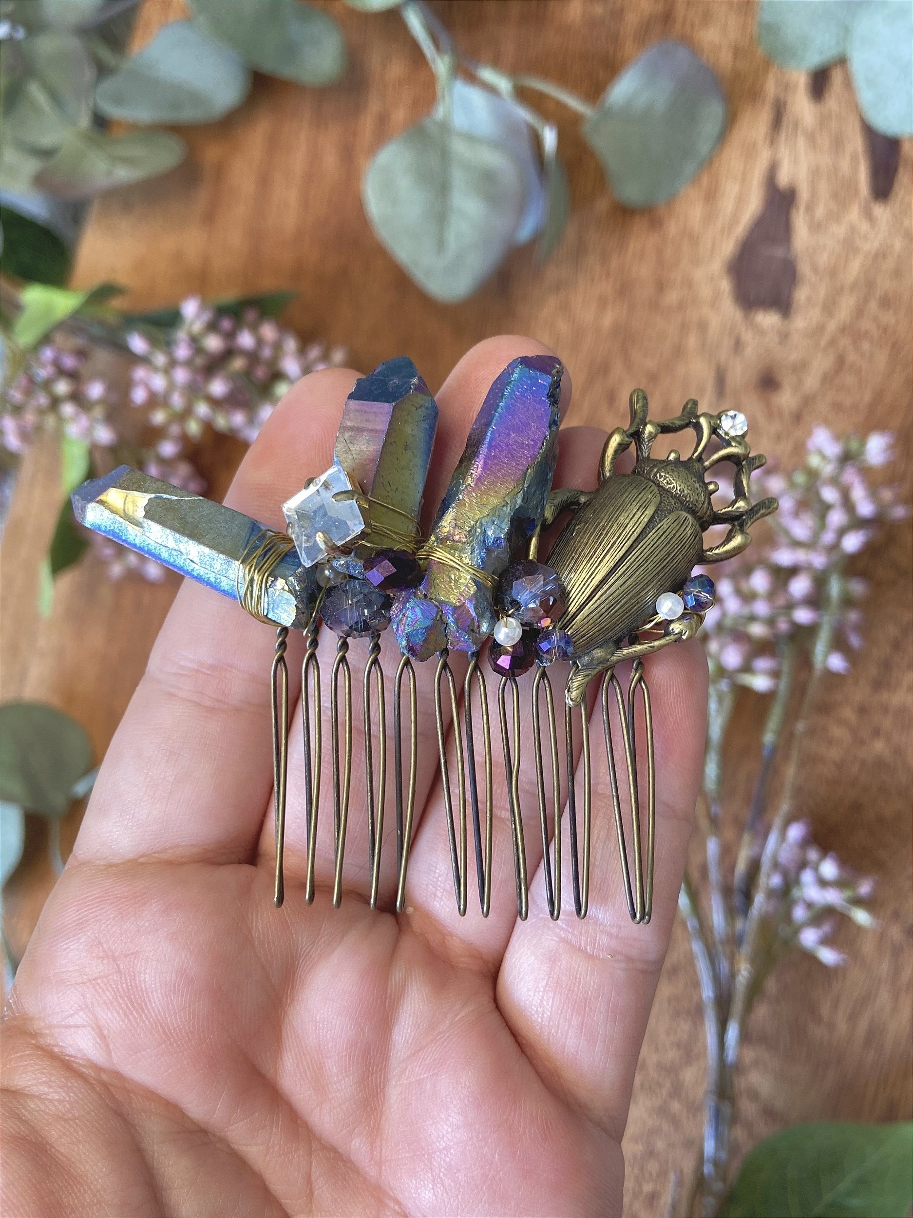 Pente com aplicação de pedrarias e ferragem em formato de besouro na cor ouro velho.