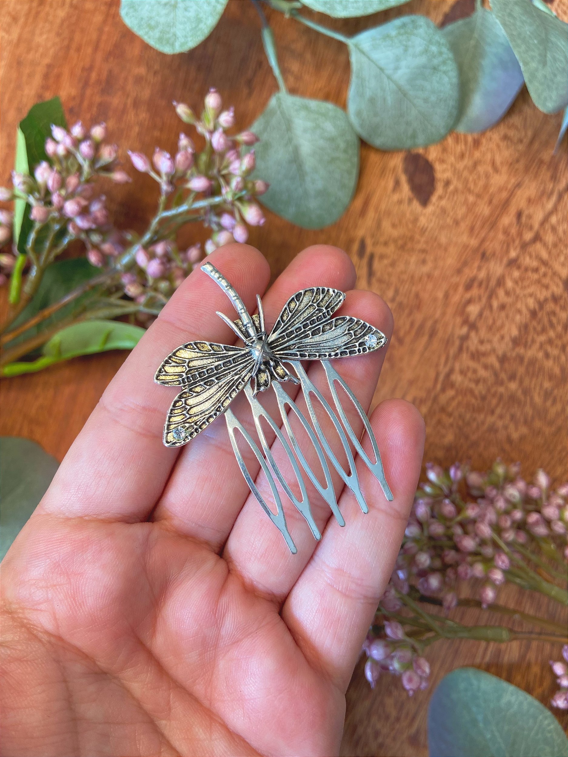 Pente em metal com aplicação de ferragem em formato de libélula.