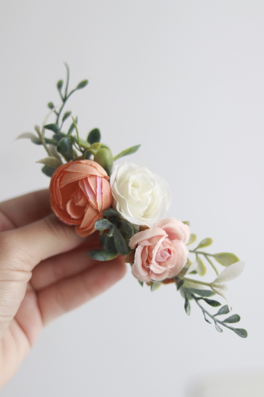 Presilha bico de pato com apliação de folhagens e flores permanentes.