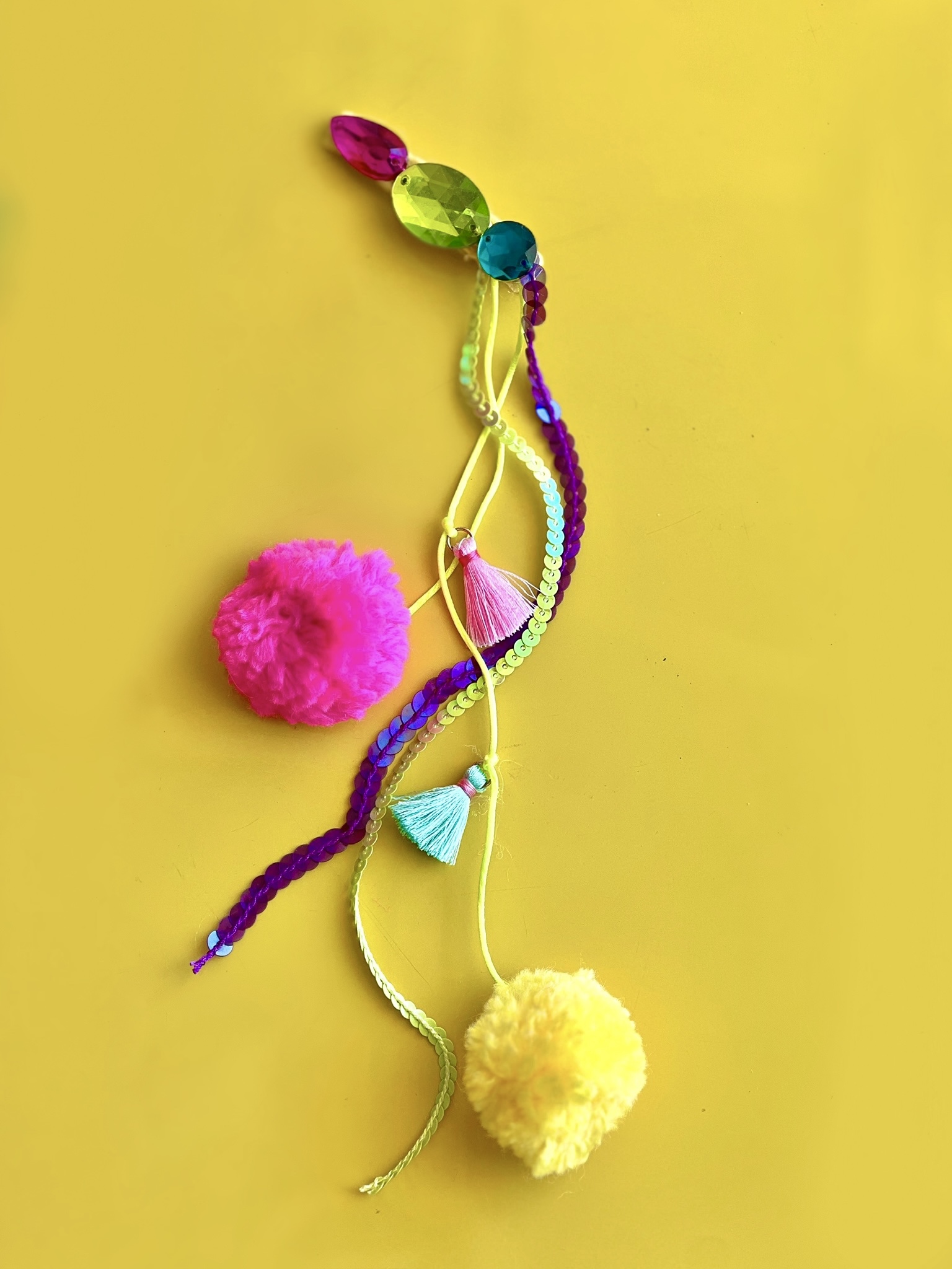 Presilha com aplicação de peças de acrílico, pompons e diversos penduricalhos. (Unidade)