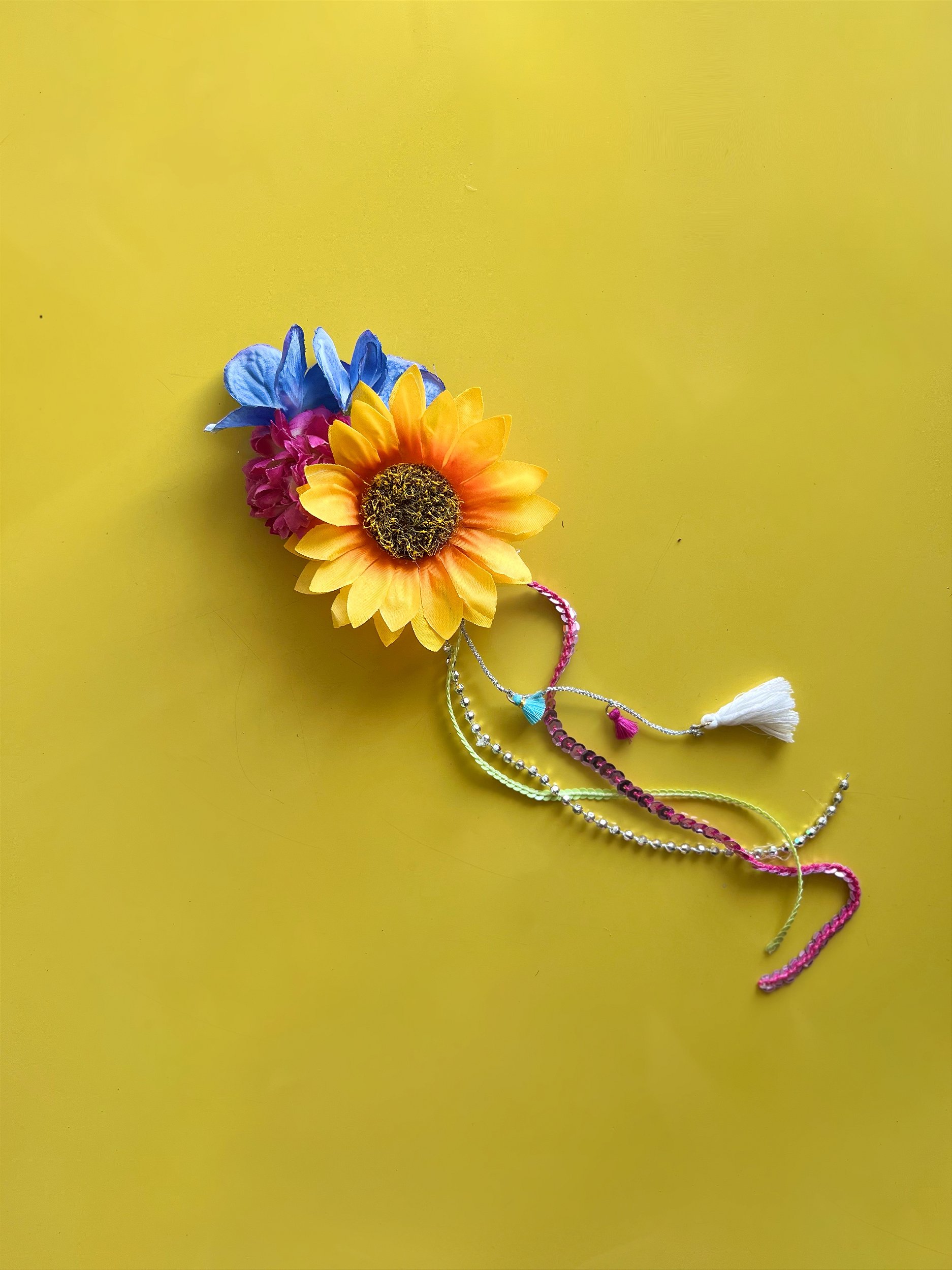 Presilha de bico de pato com aplicação de flores e penduricalhos.